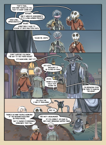 I was hoping to see what this art style could show; a little manga-ish with grey-scale shading by Copic markers. You’ll notice that Dr. Glass, Grim Reader and little Donna all have each a close shot and a wide shot. It’s to see what they’d look like with more/less detail.